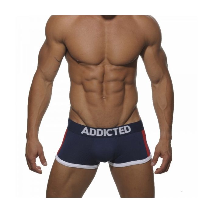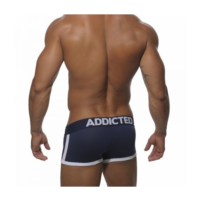 Deze AD158 Pack Up Boxer van Addicted heeft als hoofdkleur Navy Blauw met witte zomen rondom de benen die aan de zijkanten doorlopen tot aan de tailleband.