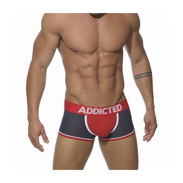De AD192 Mesh Boxer van Addicted is door zijn materialen combinatie een must-have voor iedere zelfverzekerde man. Hij is rondom gemaakt van elastische semi-transparante mesh stof, welke ademend is en een lust voor het oog. De pouch is gemaakt van katoen zodat draagcomfort wordt gegarandeerd. Door de bijzondere kleurencombinaties kan de AD192 Mesh boxershort zomaar jouw favoriete underwear worden. Deze AD192 Mesh boxershort heeft als hoofdkleur Navy Blauw. De tailleband met het Addicted logo erop, de pouch en de zomen rondom de benen zijn gemaakt in de kleur Rood. Als extra accent zijn er ook nog witte zomen rondom de pouch aangebracht. Verdere verkrijgbare kleuren zijn Zwart, Rood en Wit.- Type: Boxershort