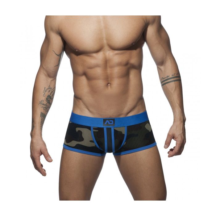 De Camo Stripe Boxer - Blauw van het merk Addicted is een sexy strakke en sportieve boxer en zit heerlijk comfortabel en luchtig! Deze boxershort is gemaakt van licht en luchtig microvezel materiaal met een micro mesh gaatjes structuur. Het micromesh heeft een stoere camouflage print en is afgewerkt met contrasterende blauwe zomen aan de randen van de pijpjes en op en rond de buidel met aangename pasvorm. Ook de elastische tailleband is blauw, is afgewerkt met een silicone Addicted logo en zit lekker laag om je heupen.