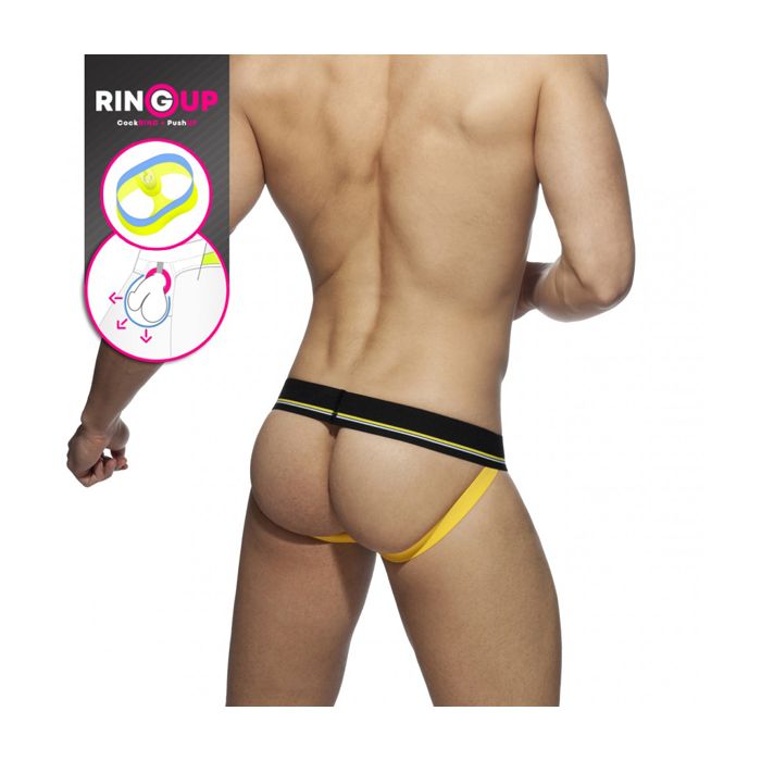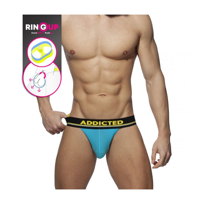 Een vollere erectie bereik je met de Cockring C-Through Jockstrap van Addicted. In deze turquoise gekleurde jock tref je een uitneembare cockring. De zachte en soepele stof is licht doorschijnend, zo is jouw mannelijkheid goed zichtbaar. De jockstrap heeft een lage, elastische zwarte tailleband met gele details. De achterkant is open en elastische banden geven de billen een lichte lift.Eigenschappen Cockring C-Through Jockstrap: