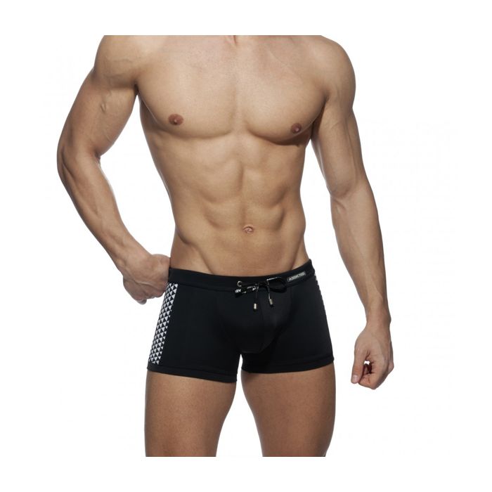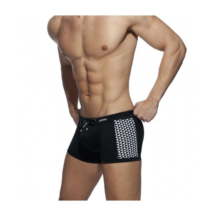 De stijlvolle Triangles Combi Swim Trunk - Zwart van Addicted heeft een speelse grafische print. De print zit aan beide zijkanten en geeft een vlotte look.
