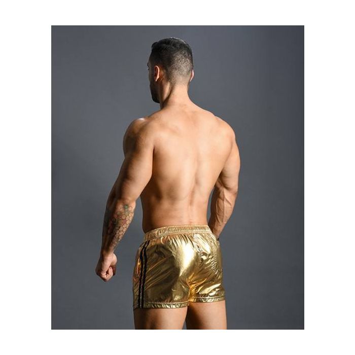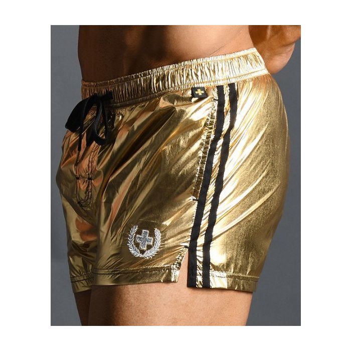 Met deze swim short van Andrew Christian zullen alle ogen op jou gericht zijn. Deze swim short heeft een super opvallende kleur, namelijk metallic goud. De swimshort beschikt over een wit binnenbroekje en is fraai afgewerkt met zwarte verticale banen op de zijkanten.- Zwemshort