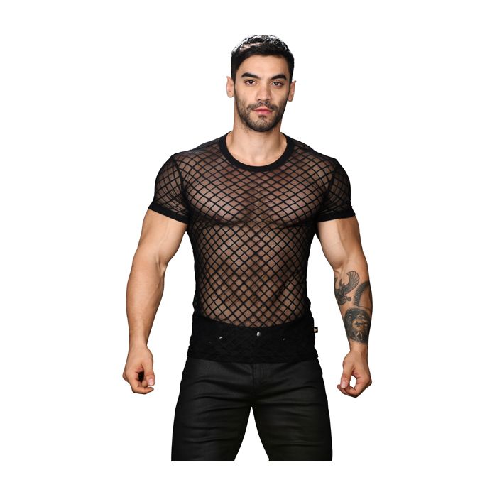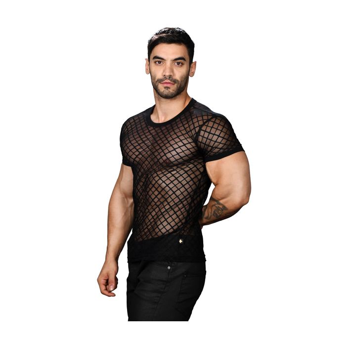 Show off your muscles! Natuurlijk in het Andrew Christian Lattice Lace Tee Shirt. Dit stijlvolle shirt is gemaakt van luchtige en doorzichte stof. Het materiaal is zacht en zit lekker strak rond je gespierde torso. Op het doorzichtige materiaal is een gekruist strepen patroon aangebracht.
