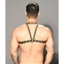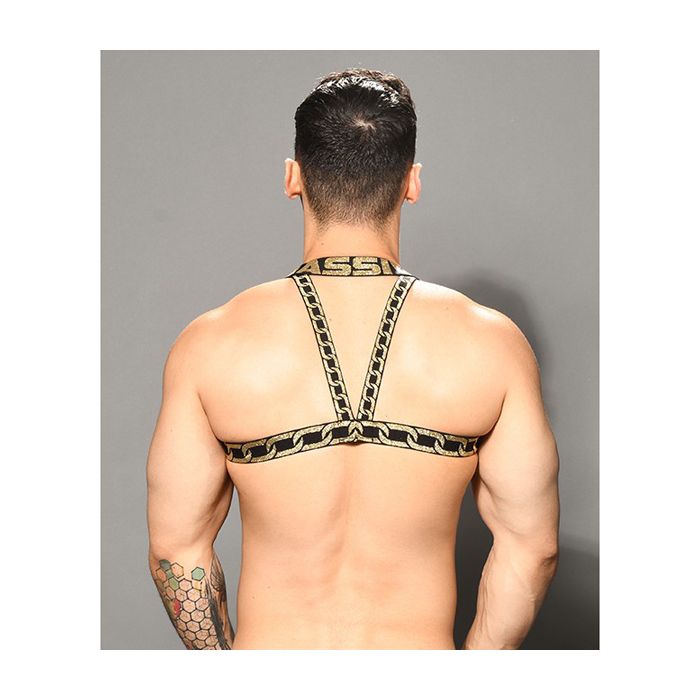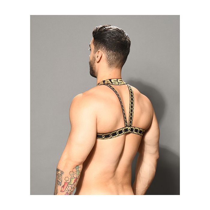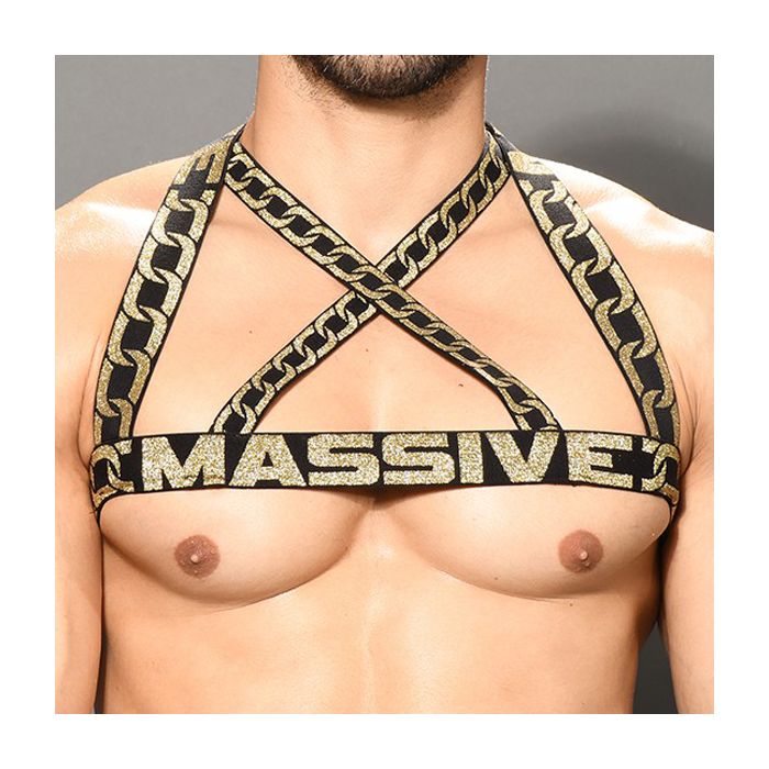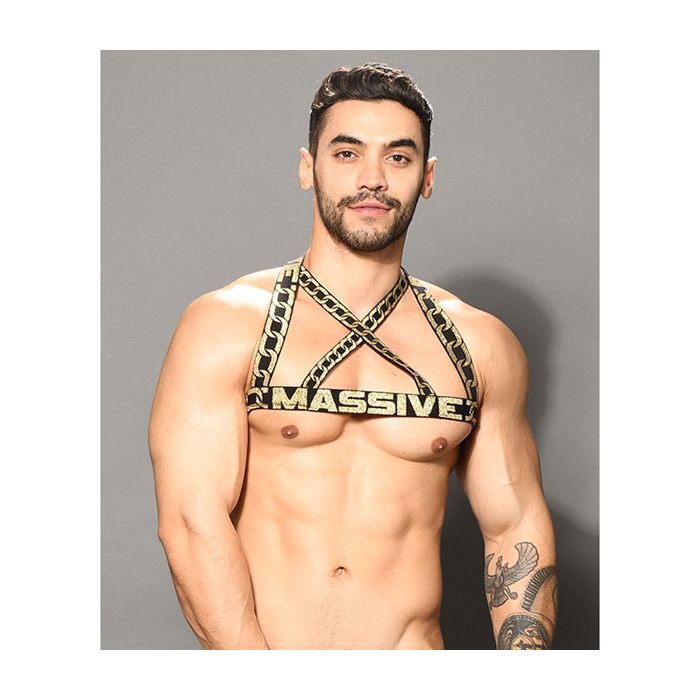 In het MASSIVE Chain Harnas van Andrew Christian lijken jouw schouders nog breder. Super sexy! De elastische banden zijn versierd met kettingen en het woord MASSIVE goudkleurig garen. De banden zitten strak rond de bovenkant van jouw torso en kunnen goede houvast bieden.Eigenschappen MASSIVE Chain Harnas:
