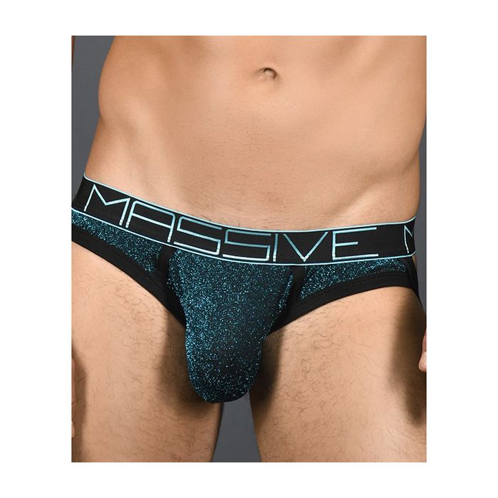In de MASSIVE Night Sparkle Bubble Butt Jock - Blauw van Andrew Christian ben jij klaar voor een feestje! Of je nu een spontaan feestje in de slaapkamer is of een kinky party in een besloten club, in deze comfortabele jockstrap met flonkerende buidel breng jij het feest met je mee. De jockstrap heeft een brede elastische tailleband met afslankend effect en MASSIVE erop afgebeeld als verwijzing naar de inhoud van de buidel uiteraard.
