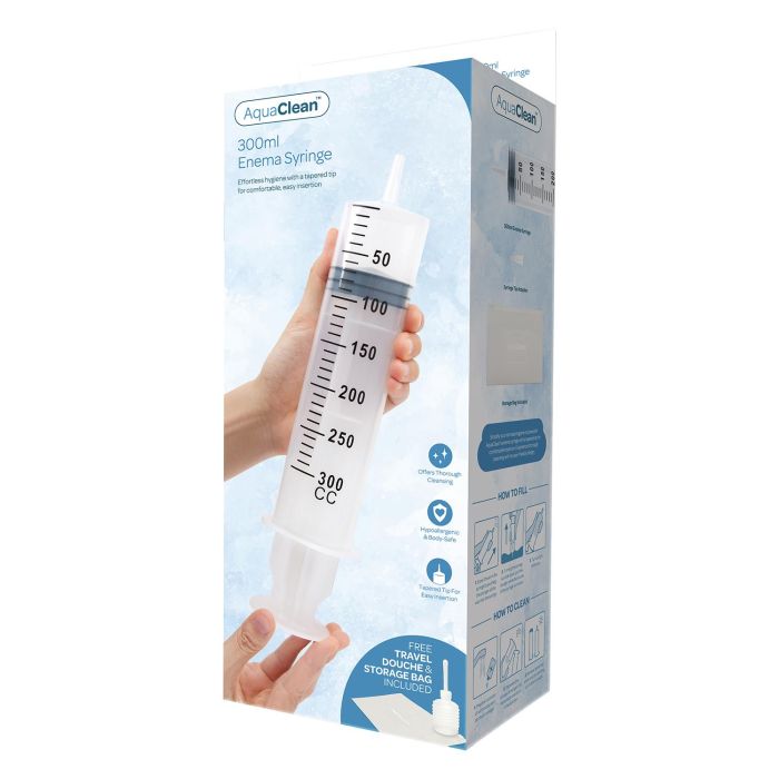 De AquaClean Klysmaspuit van 300 ml is jouw ideale partner voor moeiteloze intieme hygiëne. Met een innovatief taps toelopend ontwerp zorgt deze klysmaspuit voor een eenvoudig en comfortabel inbrengen, zodat je je altijd fris en schoon voelt, waar je ook bent. De royale capaciteit van 300 ml garandeert een effectieve reiniging zonder gedoe, perfect voor zowel dagelijks gebruik als speciale gelegenheden. Bovendien wordt de set geleverd met een handige, reisvriendelijke compacte douche en een opbergzak, waardoor je jouw hygiëne altijd en overal kunt prioriteren. Of je nu thuis bent of onderweg, met AquaClean maak je van jouw persoonlijke verzorging een zorgeloze ervaring. Kies voor AquaClean en ervaar het gemak van optimale hygiëne!