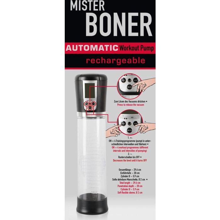 De MrBoner Automatische Pomp is jouw ultieme partner in het vergroten en verstevigen van je penis! Deze innovatieve volautomatische penispomp is uitgerust met vier afzuigstanden, zodat je de ideale druk kunt instellen voor maximale resultaten. De transparante cilinder met een handige meetschaal tot 20 cm maakt het eenvoudig om je voortgang te volgen, terwijl het digitale display je altijd inzicht geeft in de tijd en vacuümindicatie in mbar. Dit zorgt voor een gebruikservaring die niet alleen eenvoudig, maar ook uiterst nauwkeurig is. Met een totale lengte van 29,6 cm, een insteekdiepte van ongeveer 20 cm en een rekbare diameter van 2 cm, is deze pomp perfect voor iedereen die zijn prestaties wil verbeteren. Bovendien is de pomp oplaadbaar via de meegeleverde USB-kabel, zodat je altijd klaar bent voor gebruik. Geef je zelfvertrouwen een boost en ervaar de voordelen van de MrBoner Automatische Pomp!