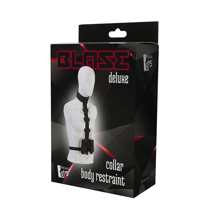 De Body Collar Blaze Deluxe is perfect voor een kinky BDSM-avond. Dankzij de verstelbare halsband, handboeien en tailleband kun je het geheel volledig op maat afstellen. De afneembare kraag en de negen stevige O-ringen bieden mogelijkheden om andere BDSM-accessoires te bevestigen, zoals kettingen of gewichten. Het luxe ontwerp met rode borduursels maakt het niet alleen functioneel, maar ook visueel aantrekkelijk. Draagbaar aan zowel de voor- als achterkant van het lichaam, deze body collar combineert comfort, veiligheid en kinky plezier.