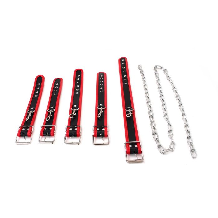 De hand- en enkelboeien, samen met de bijpassende collar, creëren een complete set die je samen met je partner kunt verkennen. Of je nu een beginner bent die zijn eerste stappen in de wereld van BDSM zet, of een ervaren gebruiker die op zoek is naar nieuwe manieren om je grenzen te verleggen, deze ketting biedt de perfecte gelegenheid om nieuwe hoogtes van genot te ontdekken.