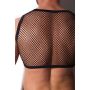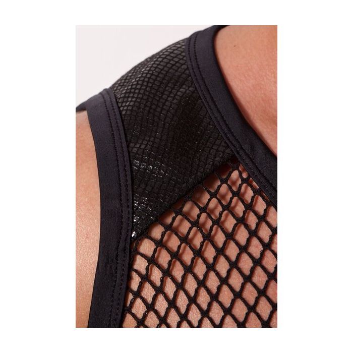 De voorkant van de top is voor de helft gemaakt van zwart mesh en voor de helft van glanzend wetlook stof. Het rugpand is volledig gemaakt van mesh. De schouders is gemaakt van zwarte stof met slangen print.