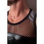 Het shirt is opgebouwd uit zwarte, wetlook stof met rekbare en grof mesh rond de schouders. Op de rechter schouder is een zilverkleurig vlak aangebracht. Het glanzende wetlook materiaal en het mesh maken de tank geschikt voor een kinky feest in de club.