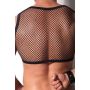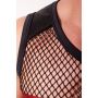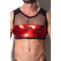 Deze korte top heeft een nauwsluitend en mouwloos model met een ronde hals. Aan de voorkant is de top voor de bovenste helft van zwart mesh gemaakt en aan de onderste helft van glanzend, rood, wetlook materiaal. De rode stof geeft een spannende look. De rug is geheel gemaakt van mesh.