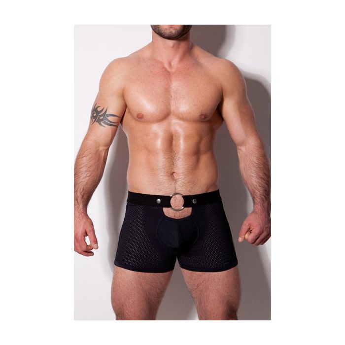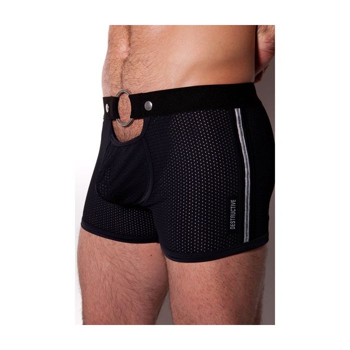 De Kinky Destructive Ring and Stripes Short is gemaakt van gladde micro mesh stof met een hoge elasticiteit. Deze stof zit lekker knus rond jouw mannelijke vormen en geeft een verleidelijk inkijkje. De short heeft een rekbare tailleband met een metalen ring in de voorkant. Onder de ring is een uitsparing in de stof boven de comfortabele buidel gemaakt.
