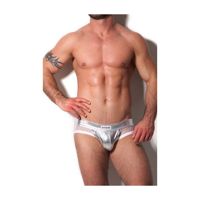 De slip heeft een zilverkleurige, rekbare tailleband met het Destructive logo voorop. Ook de ergonomische buidel is uitgevoerd in zilver, waarmee jij zekere de aandacht trekt. Rondom is de slip gemaakt van wit mesh met een grove structuur. Hierin komt jouw lekkere kontje pas echt goed tot zijn recht.
