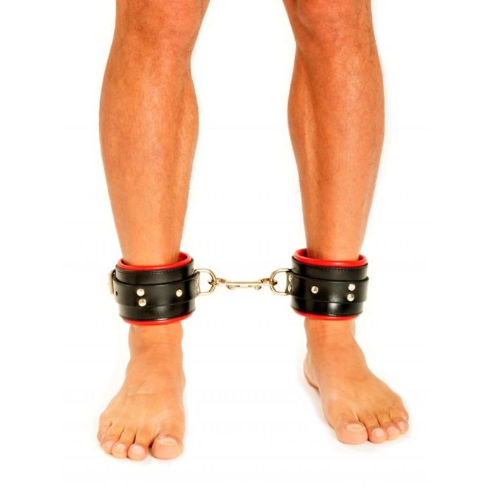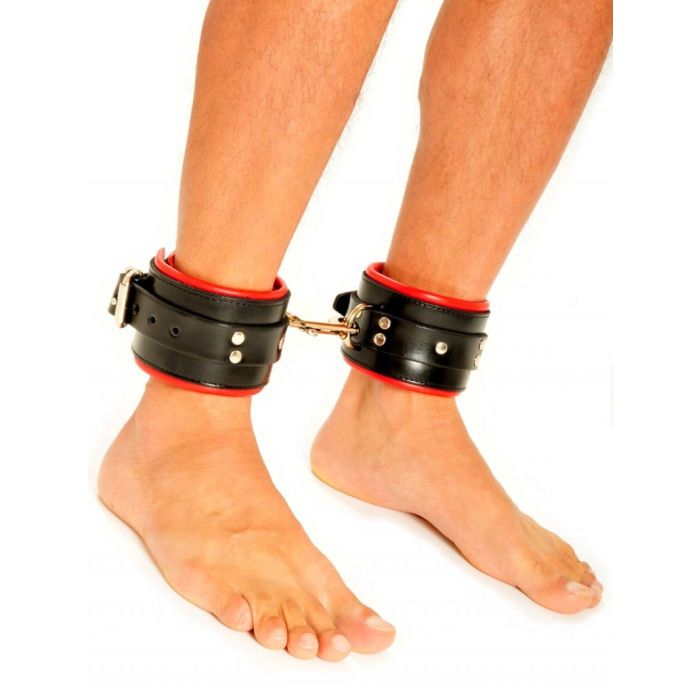 Zwarte leren enkel boeien met zacht rood gevoerde binnenzijde van leer, zodat je ze comfotabel kunt dragen. De stevige zwarte enkelboeien zijn verstelbaar en zet je vast met de stevige gesp en riem. Daarnaast zijn de boeien voorzien van een D-Ring voor meer bondage mogelijkheden. De boeien worden geleverd inclusief een duo musketon.