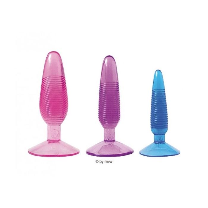 3 Geribbelde Jelly buttpluggen en verschillende maten. De ribbels zorgen voor extra stimulatie. 3 Maten:- De blauwe 12,7 cm lang met een doorsnede van 2,5 cm