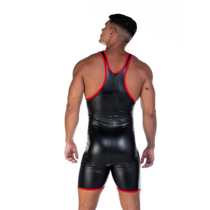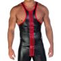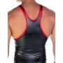 Met dragen van deze sexy singlet zal je partner zeker weten zijn ogen niet van je af kunnen houden! De singlet is gemaakt van een gladde en glanzende wetlook stof waardoor het een kinky uitstraling krijgt. De pasvorm van de singlet is nauwsluitend en daardoor zijn al je mannelijke vormen goed zichtbaar. Ook heeft de singlet contrasterende rode strepen voor een uitdagende look.