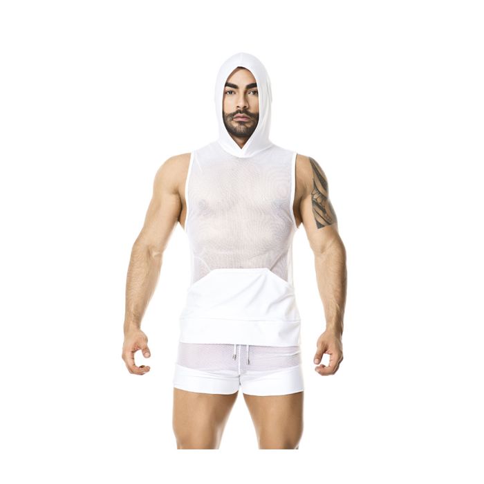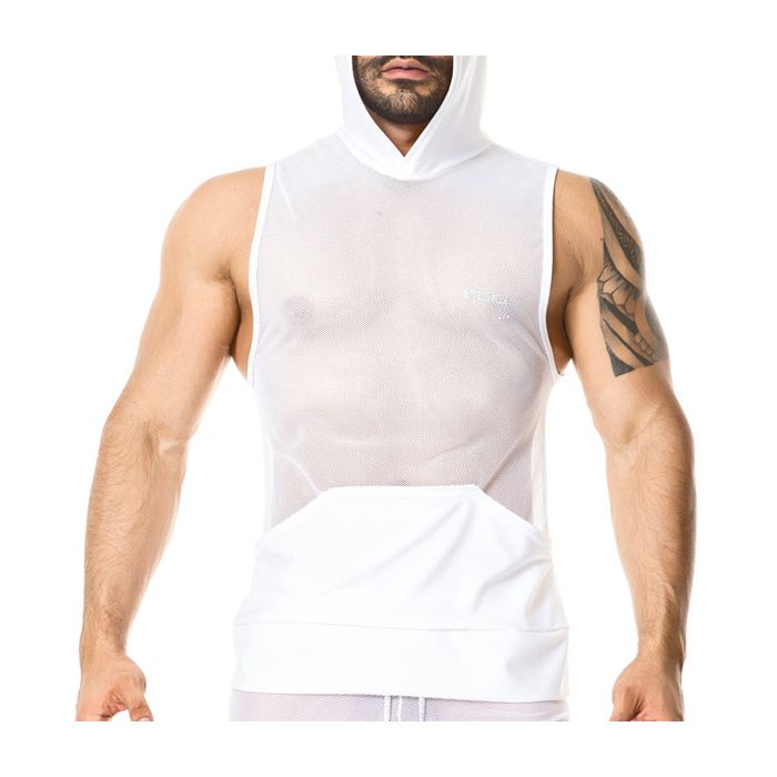 Dit witte shirt heeft een frisse look en een sportieve uitstraling. Het GIGO Hoody Mesh Shirt - Wit is gemaakt van wit mesh en afgewerkt met een capuchon en buidel. Het shirt heeft een losse pasvorm en ruime arm gaten voor een draagcomfort geschikt om in te sporten.