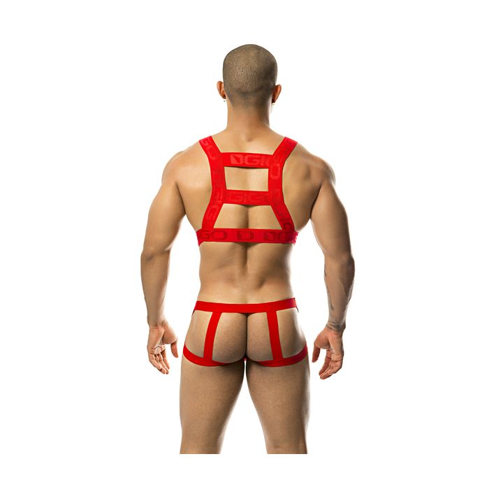 De jockstrap is verder opgebouwd uit brede, elastische banden. De banden zijn met elkaar vervlochten aan de voorkant voor een dynamisch effect. De achterkant daarentegen is een stuk statischer met rechte lijnen. De achterkant is open, zoals je mag verwachten van een sexy jockstrap!