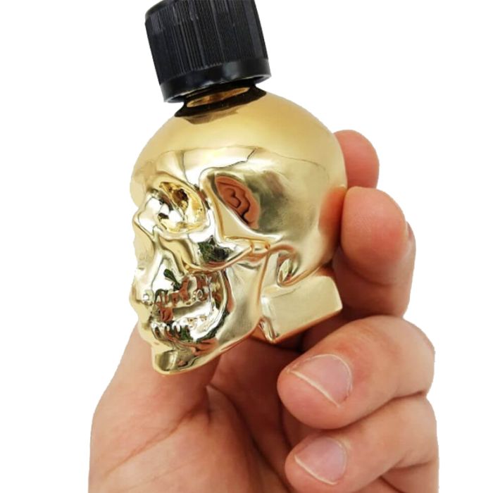 Deze zeer originele fles onderscheidt zich van alle andere poppers. De glazen fles heeft de vorm van een schedel en is naast zijn functionaliteit ook zeer decoratief. Gold Skull poppers beschikken over een krachtige formule op basis van pentyl nitrite en nemen je direct mee naar hogere sferen wanneer je aan de aroma hebt geroken. Met een handige draaiknop sluit je eenvoudig de fles weer af. Inhoud: 24 ml.