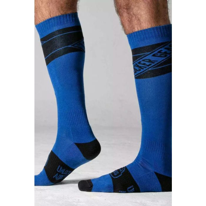 Stijl je outfit fantastisch af met het dragen van deze heren sokken van het merk Locker Gear. Je kunt deze sokken dragen bij je favoriete Locker Gear jockstrap, singlet, slip of andere uitrusting. De sokken zijn voorzien van strepen, gekleurde patches en Locker Gear-branding. Doordat de sokken op kniehoogte zijn creëer je een sexy uitstraling waardoor je partner niet van je af kan blijven! Daarnaast zijn de sokken gemaakt van een mix van katoen en nylon. Hierdoor zijn de sokken dik en super comfortabel. Verder zijn de hiel en teen gedempt en hebben ze voetboogondersteuning waardoor de sokken slijtvast zijn en heerlijk zitten!