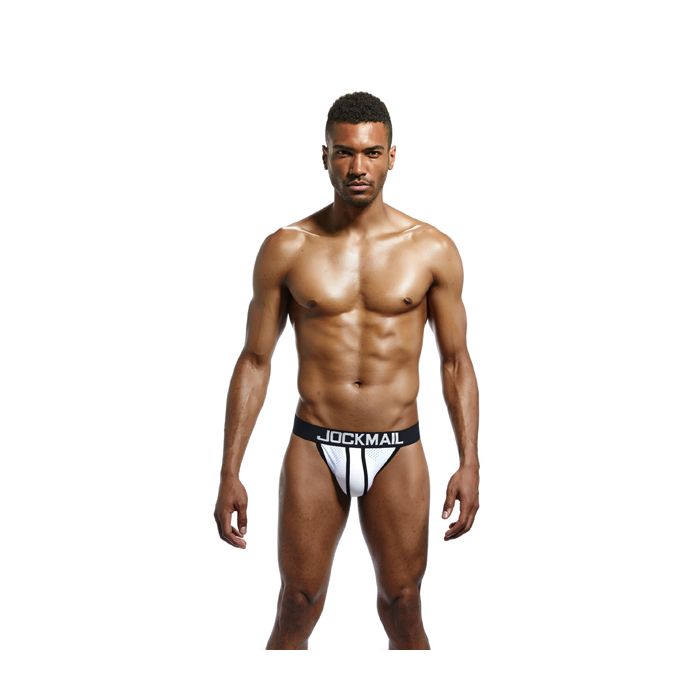 De witte uitvoering van de JM203 Jockstrap heeft een klassieke uitstraling. De slip heeft een open achterkant met elastische banden die een licht liftend effect op de billen hebben. De buidel is gemaakt van mesh voor een sportieve uitstraling. Het mesh is bovendien luchtdoorlatend en zweet bestendig.