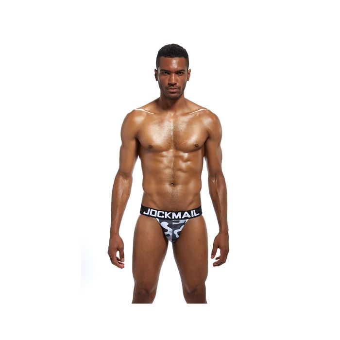 Een sexy jockstrap, camouflage print en een perfecte pasvorm. De Jockmail JM214 Camouflage Jockstrap - Zwart heeft het allemaal! Deze jockstrap heeft een brede en lage tailleband gemaakt van Jacquard geweven elastiek met geborduurd logo. De buidel is heerlijk zacht, luchtig en zweet resistent voor een super comfortabele ervaring. De elastische banden onder de billen door geven je kontje een lekkere lift.Eigenschappen JM214 Camouflage Jockstrap: