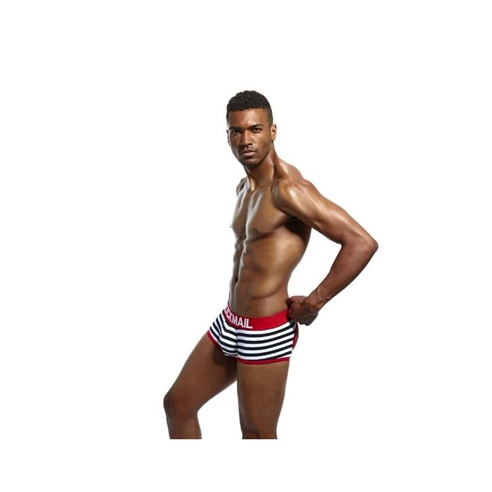 Ga voor een stijlvolle en sexy look met de Jockmail JM404 Boxer Jock Gestreept - Zwart. Deze comfortabele boxershort heeft een laag en strak model en is gemaakt van gekamd katoen en Spandex voor een super zacht, luchtig en soepel draagcomfort. De elastische tailleband zit laag om de heupen en is net als de zachte zomen rood gekleurd wat leuk afsteekt bij de zwarte en witte strepen. De achterkant is open zodat jouw lekkere kontje goed uit komt!