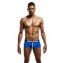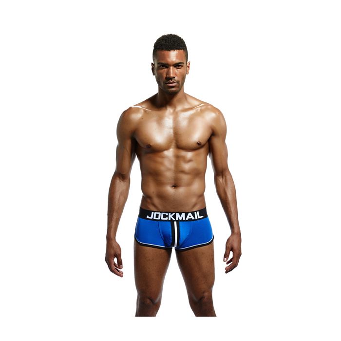 De JM406 Boxer Jock - Blauw van Jockmail is een spannende creatie. Deze strakke en lage boxershort heeft een uitnodigende open achterkant. De duotone accenten en de race strepen over de buidel geven een sportieve look. De brede, elastische tailleband is voorzien van een jacquard geweven Jockmail logo.