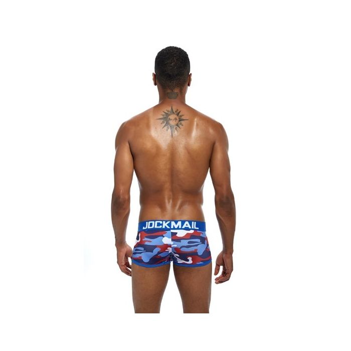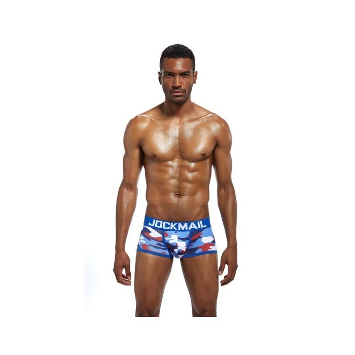 Ga voor een sprekende look met de Jockmail JM413 Camouflage Boxer - Blauw. Deze boxershort heeft een camouflage print in de kleuren rood, wit en blauw en blauwe zomen en een blauwe elastische tawilleband met wit Jockmail logo. De strakke pasvorm zit lekker knus en het zachte en luchtige katoen voelt heerlijk aan. Bovendien is deze stretch boxer zweet bestendig voor een optimaal draagcomfort.