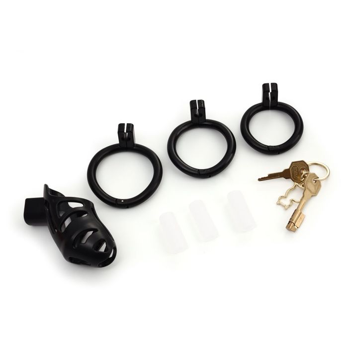 De Kuisheidskooi van het merk Sevanda heeft een stoere zwarte kleur en is dankzij het open design geschikt om langdurig te dragen. De peniskooi wordt compleet geleverd met sleuteltjes en drie basisringen in de maten 45 mm, 50 mm en 55 mm. De kooi is gemaakt van hoogwaardig kunststof, is lichtgewicht en duurzaam.