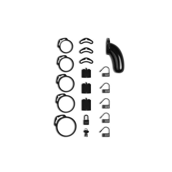 Deze geweldige set wordt geleverd met vijf ringen in verschillende maten (4,5 - 6,5 cm), zodat je altijd de perfecte pasvorm kunt vinden. Daarnaast bevat de set een metalen hangslot met twee sleutels en vijf plastic genummerde hangsloten. De plastic sloten kunnen eenvoudig met een schaar worden verwijderd na gebruik, maar de unieke nummers op elk slot zorgen ervoor dat de drager de chastity cage niet stiekem kan verwijderen en een nieuw slot kan aanbrengen zonder betrapt te worden.