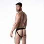 Wat deze jockstrap echt onderscheidt, zijn de innovatieve elastische leren en sportieve mesh panelen in het kruis. Deze gedurfde combinatie zorgt niet alleen voor een opvallende uitstraling, maar biedt ook uitstekende ventilatie, zodat je je fris en comfortabel blijft voelen, ongeacht de omstandigheden.