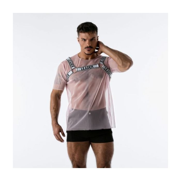 Deze Leader Mesh Harnas T-Shirt - Roze laat jouw gespierde torso komt pas echt tot zijn recht in een T-shirt van doorschijnend mesh met een aangehecht harnas. Het micro mesh houdt niets verborgen en het harnas van rekbare banden en metalen ringen laat jouw schouders er extra breed uitzien.