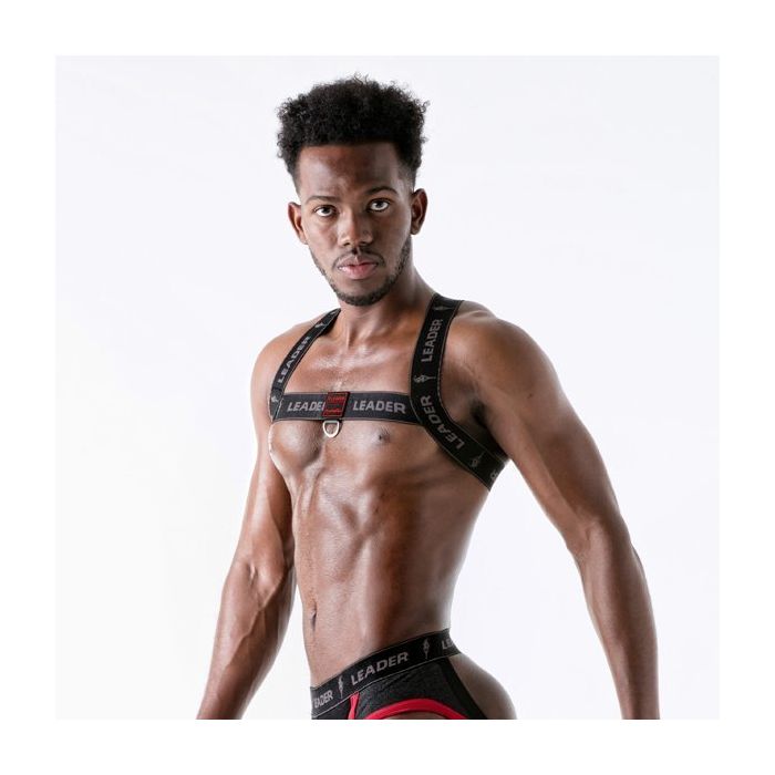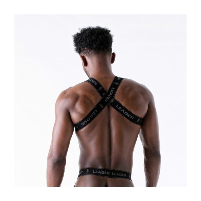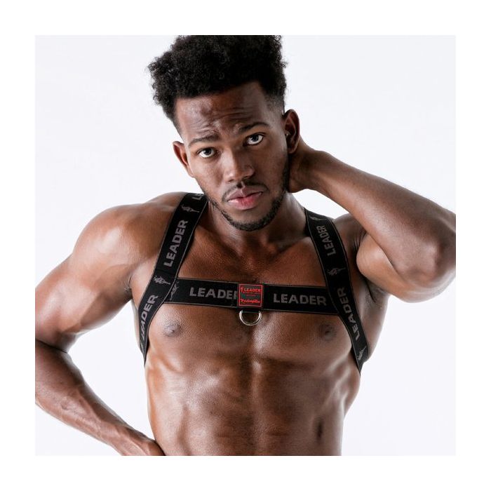 Op de elastische banden is Leader af te lezen en het Leader logo staat erop afgebeeld. Op de voorkant is een embleem van rubber aangebracht met daaronder een metalen D-ring. Het harnas heeft aan de voorkant een H-model en op de rug een X-model.