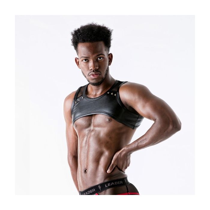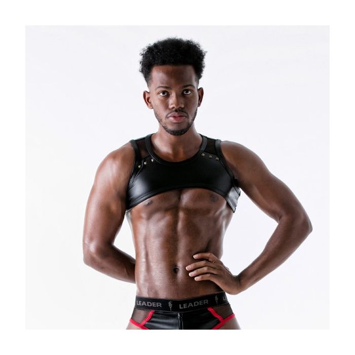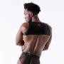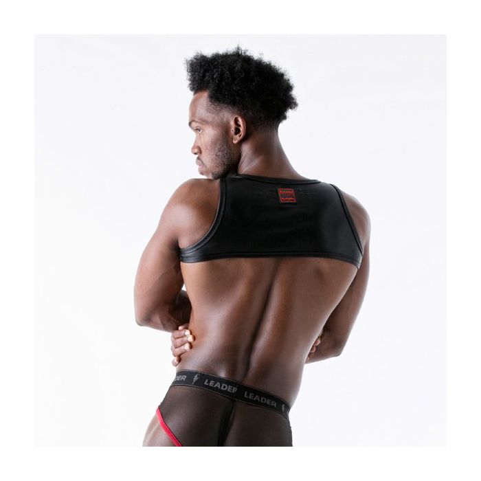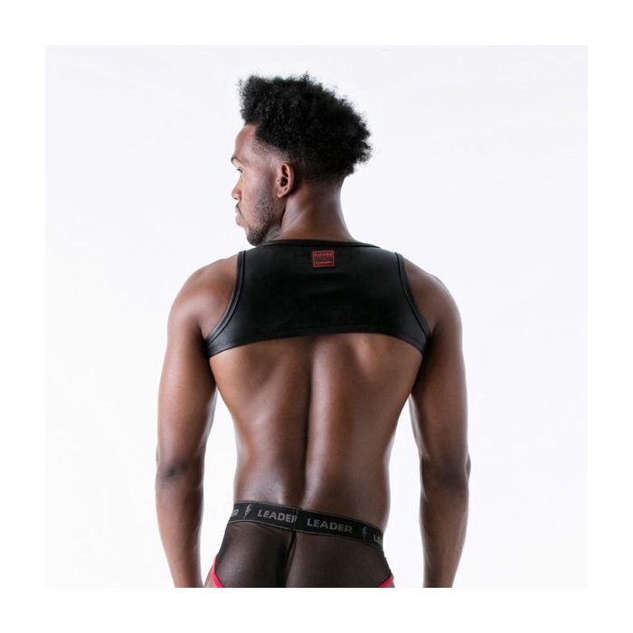 Ga voor een stoere en sexy look met het Leader Sinner Harnes - Rood. Dit geile fetisj harnas is gemaakt van kunstleer en zit heerlijk strak rond de schouders. Het model zorgt ervoor dat jouw schouders en borstspieren nog beter uitkomen. Het kunstleer is op de schouders onderbroken met mesh inzetten met piramide studs langs de rand.