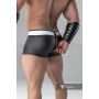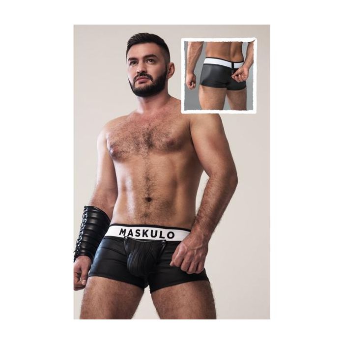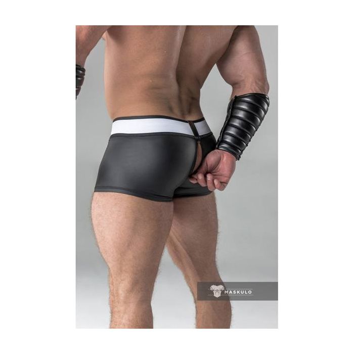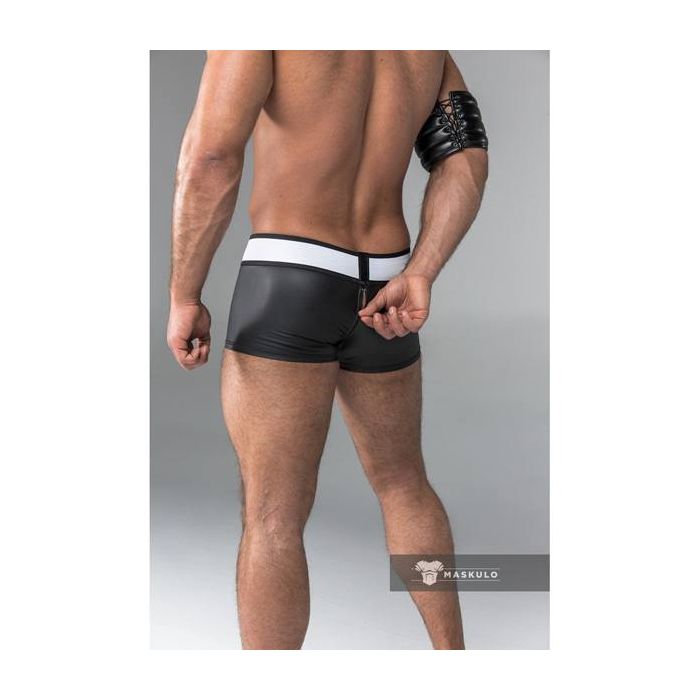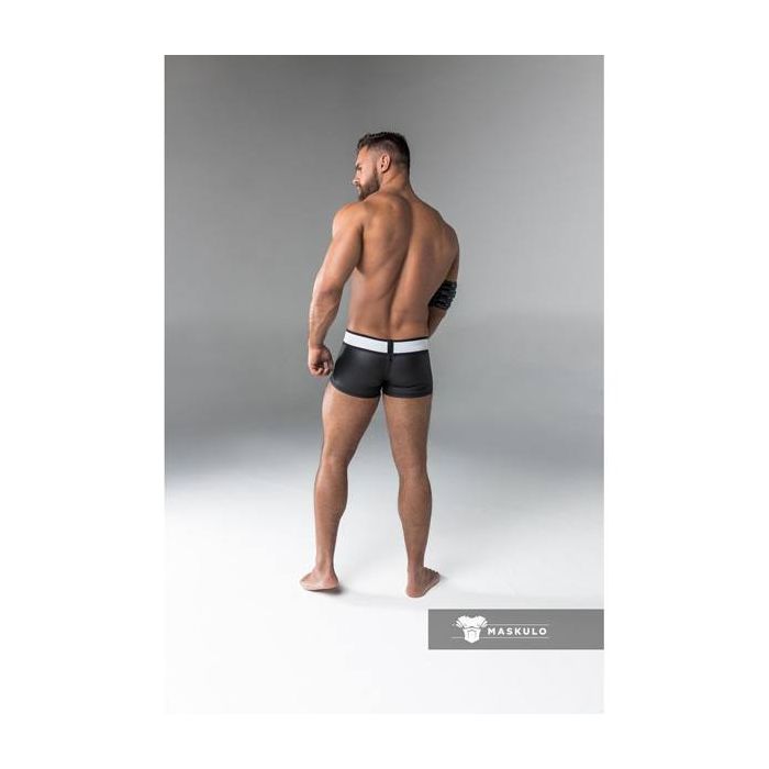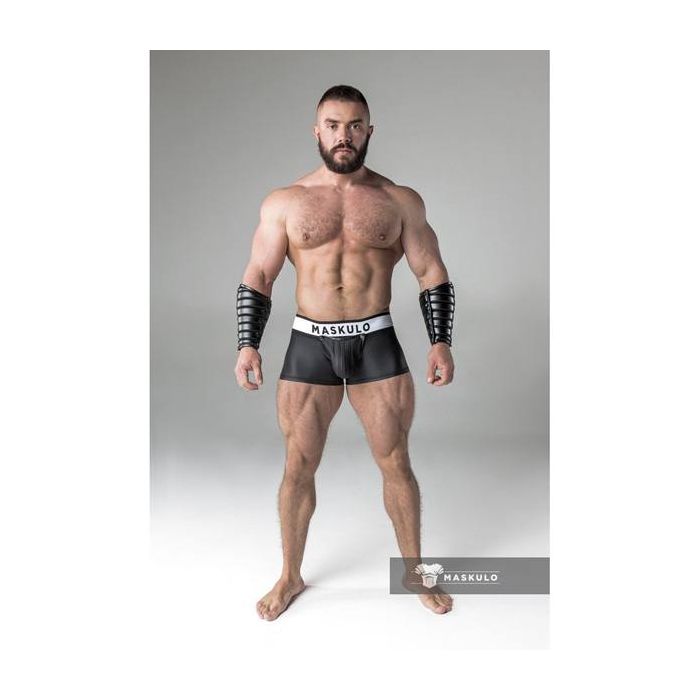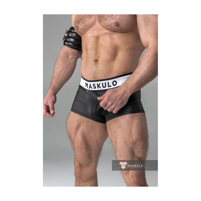 De Maskulo Armored Rubber Look Trunks - Zwart is een uitdagend zwarte boxershort die lekker strak zit en laag om de heupen. Deze kinky boxershort heeft een gevoerde buidel die volledig afneembaar is en in de achterkant is een rits gemaakt. Deze boxershort geeft dus lekker veel vrijheid om te doen wat je niet laten kunt. De rubber look krijgt iedereen opgewonden.