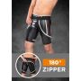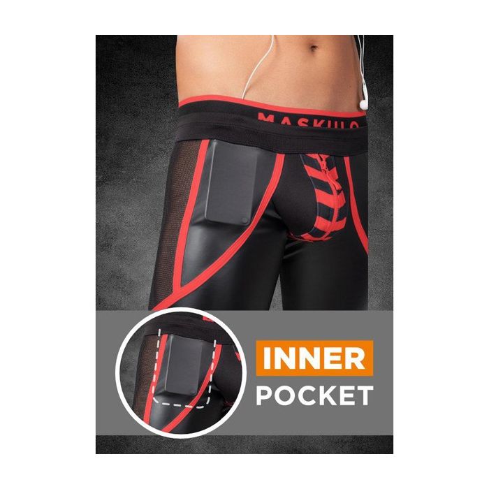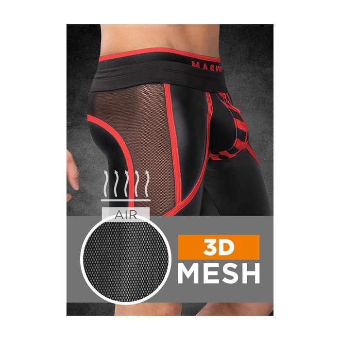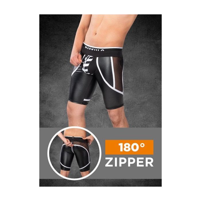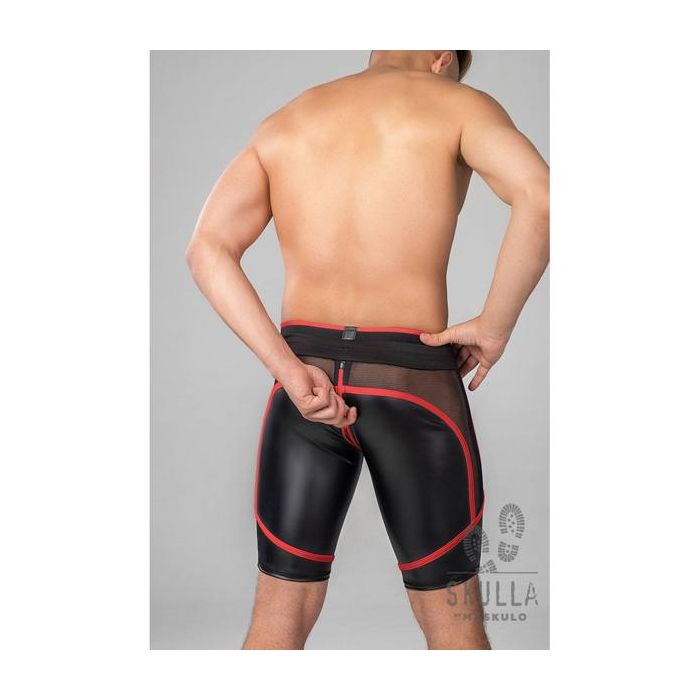 De Maskulo Skulla Men's Fetish Cycling Short - Rood brengt sport en fetish op stijlvolle wijze samen! Dit strakke fietsbroekje heeft een super sexy look door het fetish kunstleer en de delen van doorzichtig 3D mesh, langs de zijkanten en over de achterkant. De rode rits die vanaf de voorkant over de pouch, onderdoor naar de achterkant toeloopt is de leidraad voor spannende avontuurtjes. De dubbele elastische tailleband suggereert ondergoed dat verleidelijk boven de broek uitkomt. De binnenkant van het kruis zorgt voor een groter ogend zaakje en de pijlen print zal ook zeker de aandacht naar the goods toe trekken.