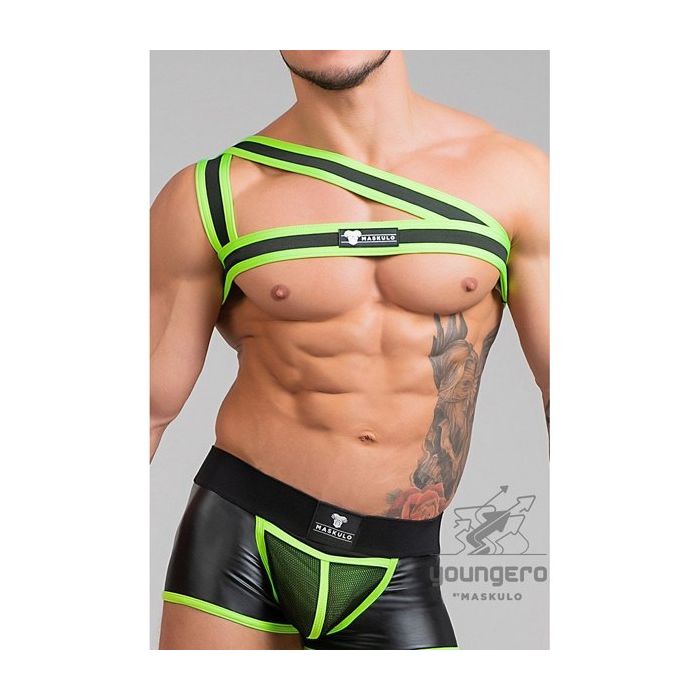 Wordt het stralende middelpunt op ieder sexy feest in de Youngero Asymmetrical One Shoulder Harnas - Neon Groen van Maskulo. Dit harnas heeft een dynamisch asymmetrisch model en bestaat uit 3 banden die jouw gespierde bovenlijf accentueren en schouders nog breder laat lijken. Helemaal wanneer je onder UV-licht komt zul je gezien worden, door het oplichtende neon materiaal.