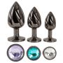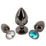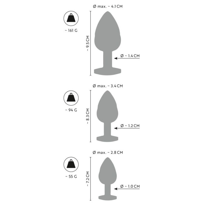 Ontdek de Decoratieve Trio Pluggen van ANOS, een verfijnde set van metalen butt plugs die speciaal zijn ontworpen om zowel beginners als gevorderden een ongeëvenaarde ervaring van anale stimulatie te bieden. Deze set bestaat uit drie zorgvuldig vervaardigde pluggen, elk met unieke afmetingen en gewichten, waardoor ze ideaal zijn voor rektraining en het verkennen van nieuwe sensaties. De pluggen zijn niet alleen functioneel, maar ook visueel aantrekkelijk, dankzij de schitterende, gekleurde edelstenen die zijn geïntegreerd in het ontwerp. Deze edelstenen dragen bij aan de esthetiek en zorgen tegelijkertijd voor een veilige en comfortabele ervaring, dankzij de anaalveilige stop die voorkomt dat de pluggen te diep in het lichaam kunnen glijden.