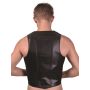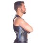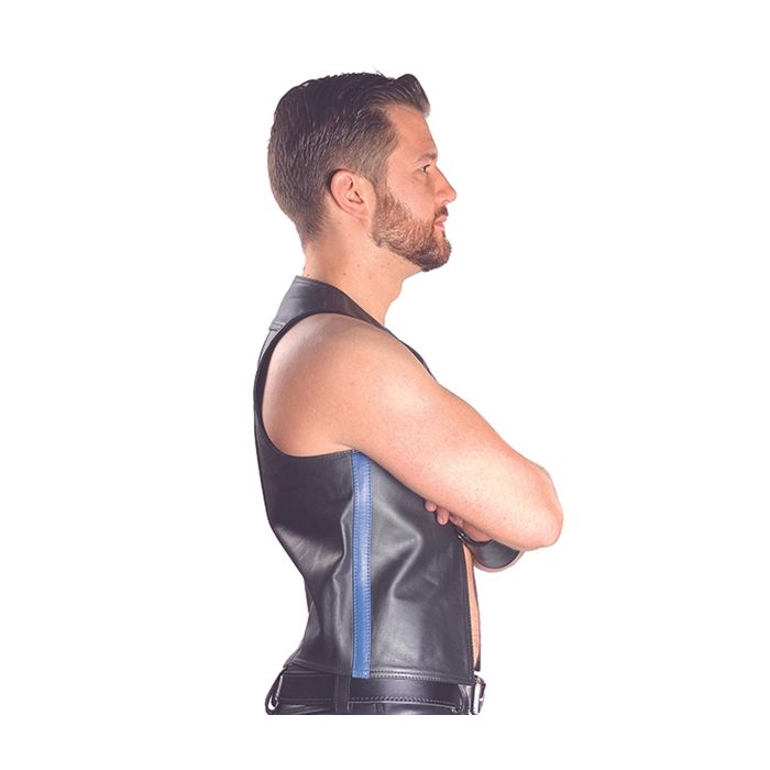 Het Mister B Muscle Vest is gemaakt van hoogwaardig leer. Het vest is zwart van kleur met aan de zijkanten een verticale blauwe streep. Ook verkrijgbaar met witte of rode streep of geheel zwart.