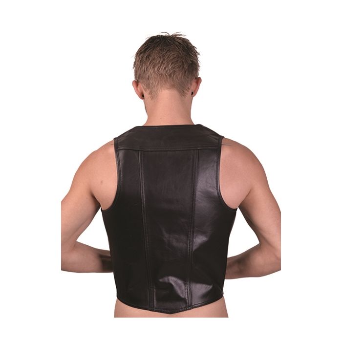 Het Mister B Muscle Vest is gemaakt van hoogwaardig leer. Het vest is zwart van kleur met aan de zijkanten een verticale witte streep. Ook verkrijgbaar met rode of blauwe streep of geheel zwart.