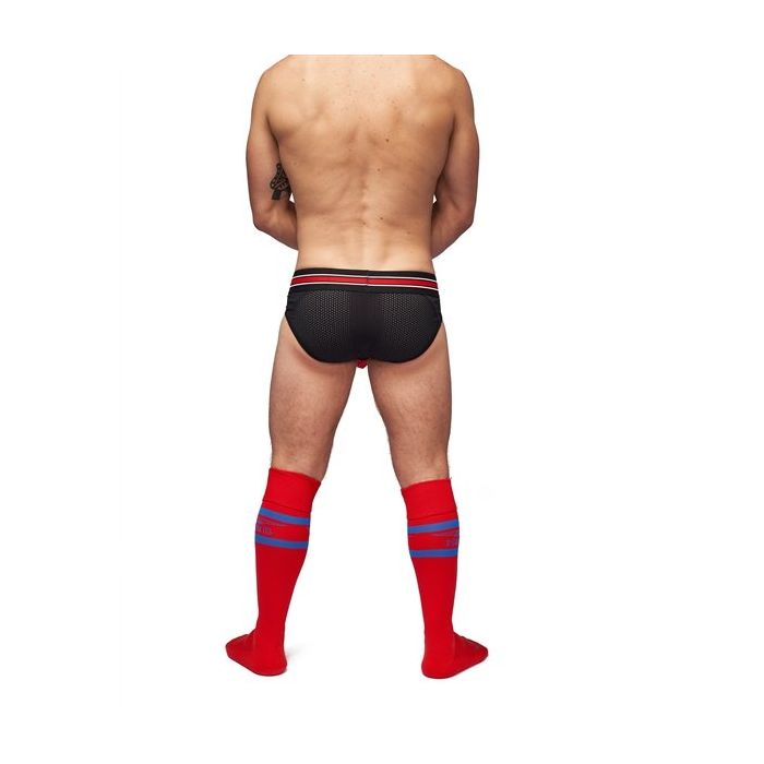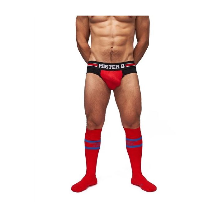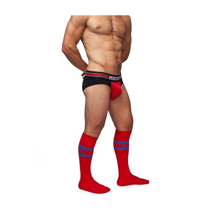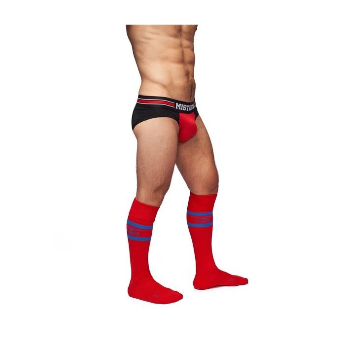 Deze stoere voetbalsokken van Mister B hebben een prachtige rood met blauwe kleur. De rode kleur is speciaal voor de liefhebbers van vuistneuken. De blauwe kleur voor degenen die echt van anaal houden en het willen laten zien. Aan de zijkant is de Mister B logo aangebracht.