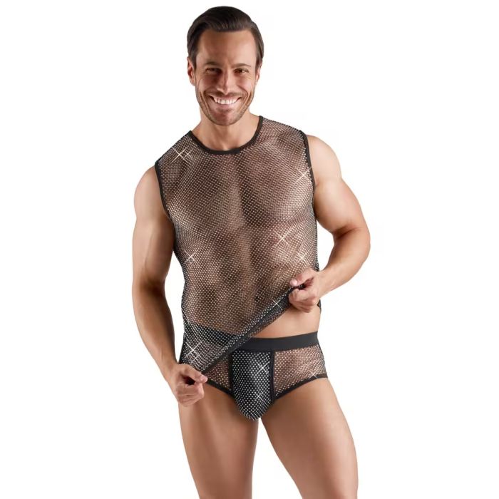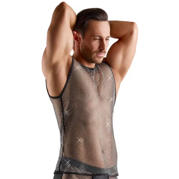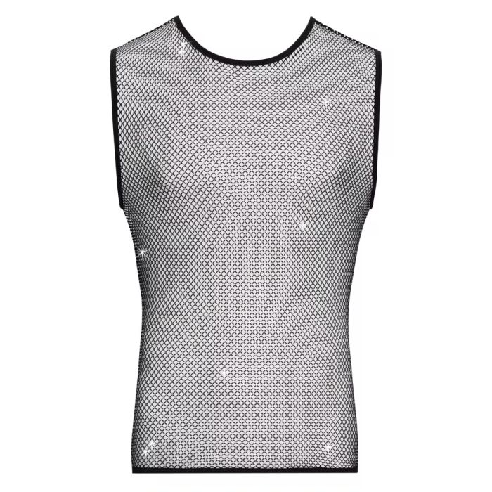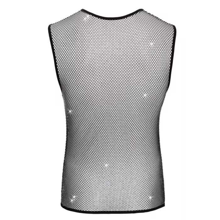 De spannende zwarte transparantie geeft een vleugje mysterie en allure, terwijl de fonkelende strassteentjes het licht op een betoverende manier vangen. Of je nu een avondje uit gaat met vrienden of een speciale gelegenheid viert, dit shirt zorgt ervoor dat je in het middelpunt van de belangstelling staat. De combinatie van het luchtige mesh materiaal en de glinsterende details maakt het niet alleen een lust voor het oog, maar ook een must-have voor je garderobe.