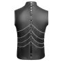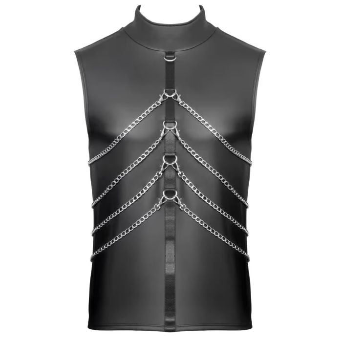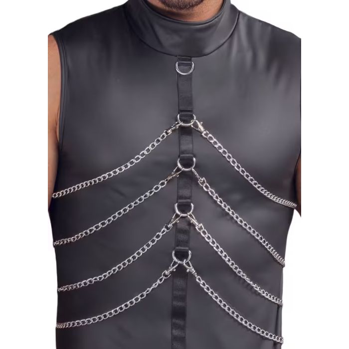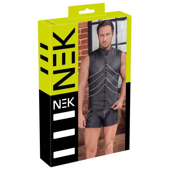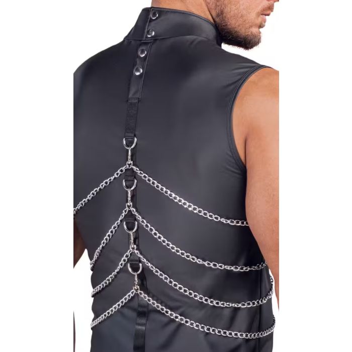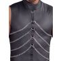 Het ontwerp van dit shirt is niet alleen stijlvol, maar ook praktisch. Zowel de voor- als achterkant zijn voorzien van een aangezette sluiting met enkelringen, waar je de vier bijgeleverde karabijnkettingen eenvoudig aan kunt bevestigen. Dit geeft je de vrijheid om je look in een handomdraai te veranderen. Daarnaast zorgt de korte drukknoopsluiting achter in de nek ervoor dat je het shirt snel en gemakkelijk kunt openen en sluiten.