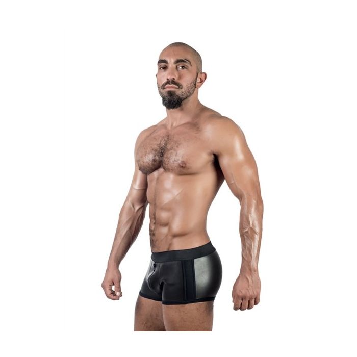Voor een sexy look is dit de perfecte short. Deze short is gemaakt van dik neopreen materiaal en is rekbaar voor een perfecte pasvorm. De short is afgewerkt met zwarte stiksels voor een stoere look met aan de zijkanten mesh materiaal. En de brede band zit lekker strak om je heupen heen. De neopreen short heeft een 3-way zipper die geheel doorloopt naar achteren zodat jij wanneer het heet wordt in je broekje, snel je toverstaf tevoorschijn kan halen, of je kontje kan showen.
