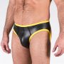 Laat je zien in deze geweldige open for now bottomm jockstrap en straal op elk fetish feestje. De jockstrap is gemaakt van stevig neopreen materiaal en heeft een voorgevormde pouch waar jij je zaakje lekker in kan laten rusten. De brede banden die aan de onderkant van de billen lopen geven je billen een lift. De randen zijn afgewerkt met gele biesen.