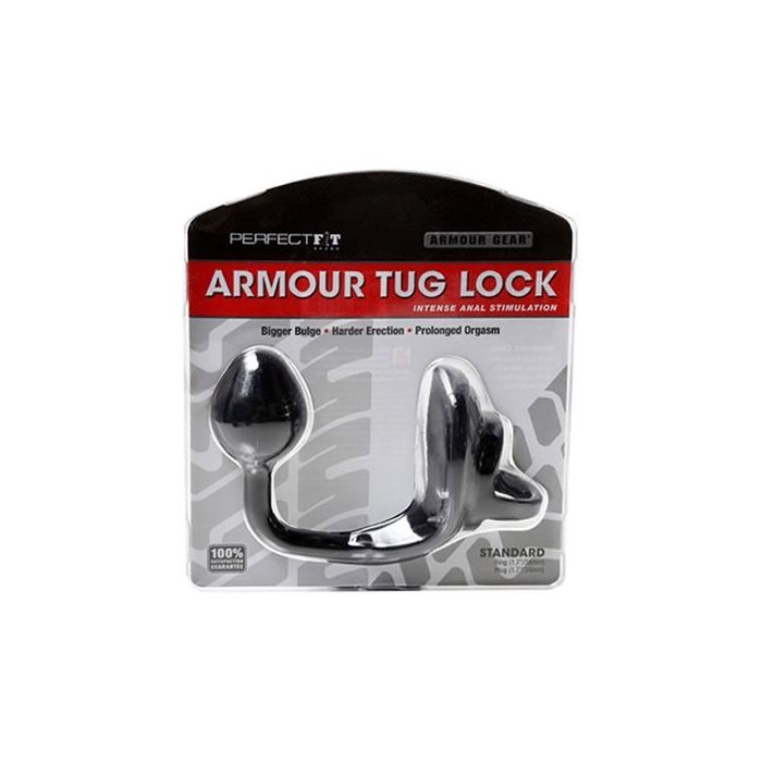 De Armour Tug Lock cockring is voorzien van een buttplug. Deze cockring zorgt ervoor dat je hele zaakje perfect naar voren wordt geduwd, waardoor alles groter lijkt. De band zorgt voor extra ruimte tussen de ballen de de penis.- Verkrijgbaar in zwart en transparant
