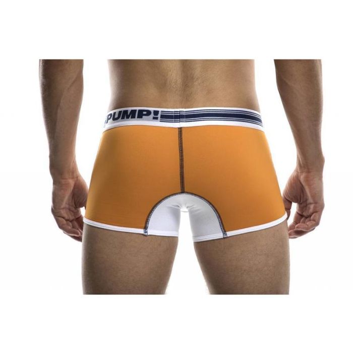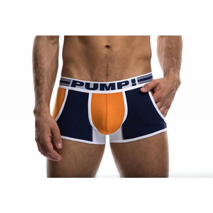 Het jogger model boxershort uit de collectie van Pump heeft een atletische casual look door de steekzakken aan de voorkant. De Varsity Jooger Boxershort heeft een extra opvallende uitstraling door de oranje pouch van luchtig micro-mesh, de witte zomen en de donkerblauwe kleurvlakken.