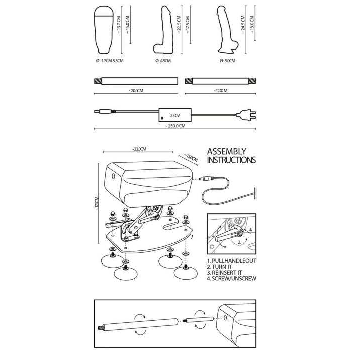 - Seksmachine (22cm x 15cm x 17cm), stang 12cm lang, verlengstang 20cm lang. Stroomkabel incl. adapter 280